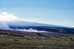 Barren Landscape with scattered shrubs give way to a crater lake with steam rising up from the surface. A few bunches of fluffy scattered clouds taint the blue sky and blur the mountains on the horizon.