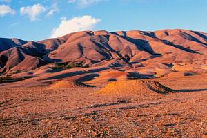 Red, orange and yellow sand stone rocks rise up from the desert against the blue sky